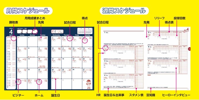 月間スケジュールでは、公式戦全スケジュール(対戦日、対戦相手、場所、時間)と勝敗がひとめでわかるレイアウトになっています。また週間スケジュールでは、得点表、スターティングメンバー、リリーフ、ヒーローインタビューなど細かく記録できるのが特徴となっています。
