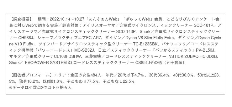 園児とママ・パパの情報誌「あんふぁん」「ぎゅって」を発行する株式会社こどもりびんぐ(所在地:東京都千代田区、代表取締役:中島一弘)は、 「シルミル研究所」としてリサーチ事業を展開しています。「シルミル研究所」では、全国の女性を対象とした調査「ウーマンリサーチ」を実施し、女性が選ぶおすすめの商品やサービスをランキング形式で、Webコンテンツとして発信しています。今回は2022年10月に実施した「スティック掃除機についての調査」の結果を発表します。