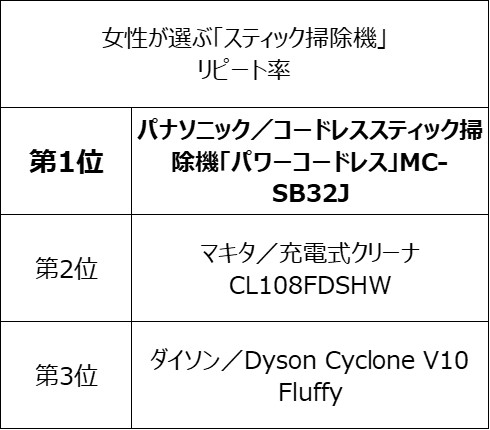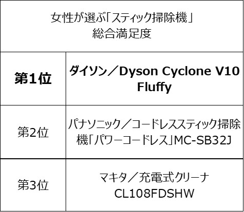 2022年10月に実施した調査において、「ダイソン/Dyson V8 Slim Fluffy Extra 」が女性が選ぶ「スティック掃除機」利用率第1位、 「ダイソン/Dyson Cyclone V10 Fluffy 」は総合満足度第1位(同商品は吸引力満足度、オススメ率も第1位)、「パナソニック/コードレススティック掃除機『パワーコードレス』MC-SB32J 」はリピート率第1位を受賞しました。