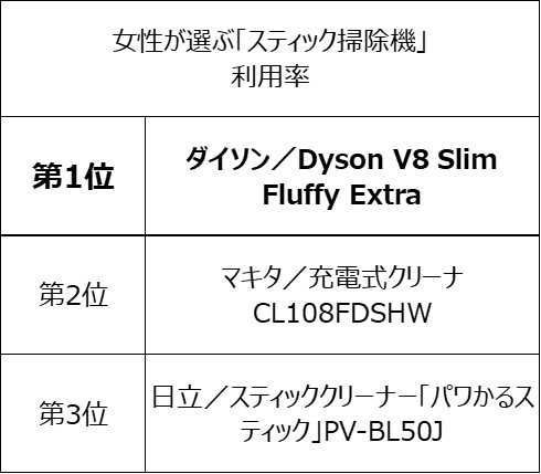 ◆女性が選ぶ「スティック掃除機」ランキング、利用率1位は「ダイソン/Dyson V8 Slim Fluffy Extra 」