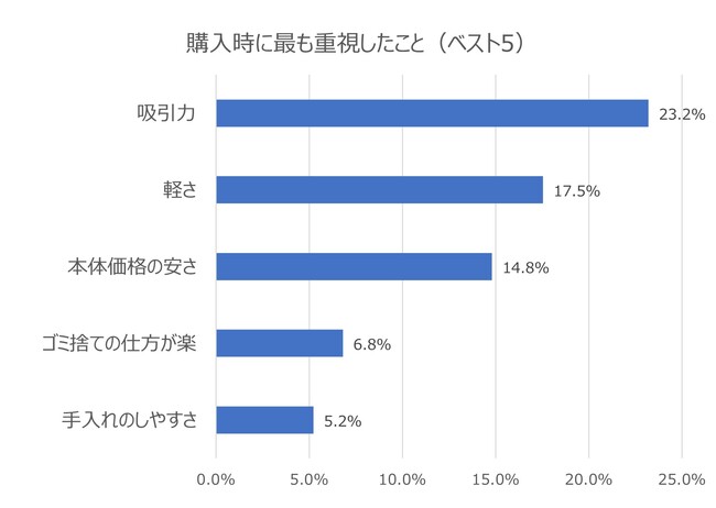 スティック掃除機の購入時に最も重視したことは「吸引力」 が23.2%と最多、「軽さ」「本体価格の安さ」という回答に。