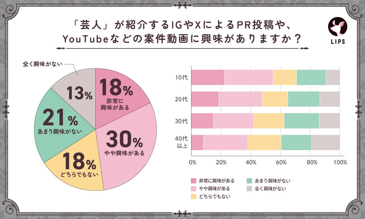 芸人がSNSなどで紹介するタイアップ投稿については、全体の約半数が興味を示しているという結果に。自分の言葉でユーモアたっぷりに商品特徴を紹介されるとすっと頭に入ってくるなどといったポジティブな意見が寄せられました。