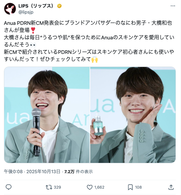 惜しくも10位以内へのランクインは逃しましたが、メロいアイドルに関するアンケートで上位に名前が挙がったなにわ男子・大橋和也さん。先日の「Anua」新CM発表会に登場した大橋さんを紹介するXの投稿は、10月末時点で7.2万インプレッションを超えるなど、大きな反響を呼んでいます。