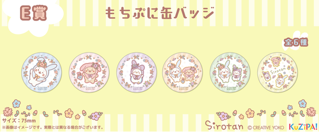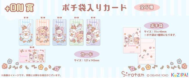 商品は、ぎゅっとぬいぐるみセット、マウスパッド、二つ折りミラー、アクリルブロック、もちぷに缶バッジ、さらにくじを1点購入毎にチャレンジできる「+On Challenge」の景品のポチ袋入りカードもご用意しています。『しろたん』KuZiPA!限定描きおろしグッズを是非ゲットしてください!