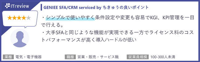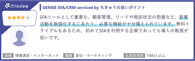 今回は、当社の営業管理ツール「GENIEE SFA/CRM」がITreview Grid Award 2023 Springにおいて顧客満足度の優れた製品に贈られる「High Performer」をSFA部門、CRM部門の2部門にて受賞することができました。2022年3月までに掲載されたレビューの集計結果をもとに選ばれ、使いやすさや費用対効果の高さに対する好評価のコメントが多く寄せられました。