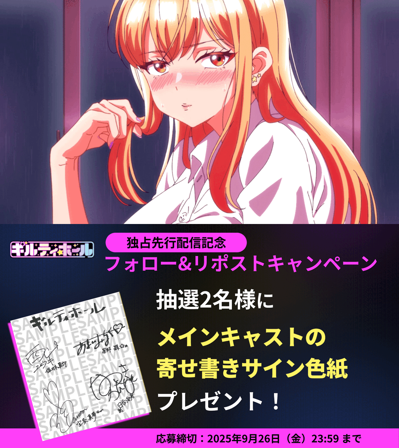 全てが許される『ギルティホール』へようこそ――2025年秋アニメ『ギルティホール』メインキャストの寄せ書きサイン色紙が当たるプレゼントキャンペーンを開催中!