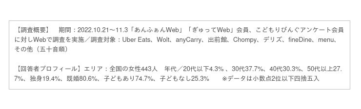 園児とママ・パパの情報誌「あんふぁん」「ぎゅって」を発行する株式会社こどもりびんぐ(所在地:東京都千代田区、代表取締役:中島一弘)は、 「シルミル研究所」としてリサーチ事業を展開しています。「シルミル研究所」では、全国の女性を対象とした調査「ウーマンリサーチ」を実施し、女性が選ぶおすすめの商品やサービスをランキング形式で、Webコンテンツとして発信しています。今回は2022年10〜11月に実施した「フードデリバリーについての調査」の結果を発表します。