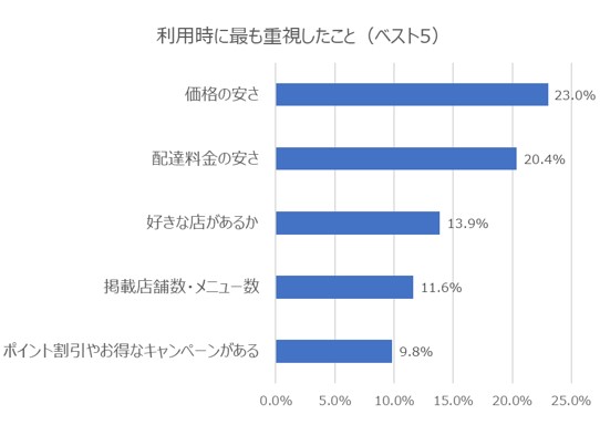 フードデリバリーの利用時に最も重視したことは、「価格の安さ」 (23.0%)が1位に。次いで「配達料金の安さ」 (20.4%) 、「好きな店があるか」 (13.9%) 、「掲載店舗数・メニュー数」 (11.6%) 、「ポイント割引やお得なキャンペーンがある」 (9.8%)という結果になりました(複数回答)。