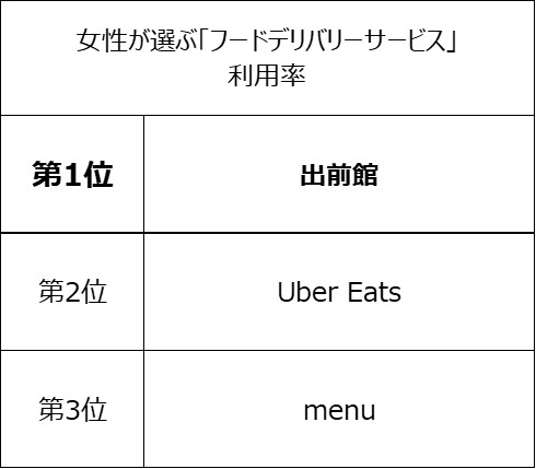 ◆女性が選ぶ「フードデリバリー」ランキング、利用率1位は「出前館」
