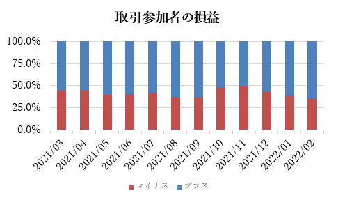 FX取引における実現損益でプラスは64.0%、マイナスは36.0%となった。プラスは前月比で3.2ポイント上昇。為替相場は、ロシアのウクライナ侵攻で地政学リスクが急上昇し、地理的関係からユーロ安が鮮明になった。一方、軍事需要から商品価格が暴騰したことで資源国通貨は底堅く推移した。個人投資家は、足元の市場テーマを的確にとらえ利益を積み上げたと推察される。