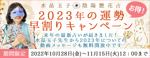 今年も残すところあと2ヶ月ほどとなりました。そこで、月額公式サイト『水晶玉子 陰陽艶花占』では『2023年の運勢 早割りキャンペーン』を公開しました。対象の2023年の運勢鑑定がお得にご購入いただけます!