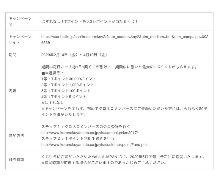今回のリニューアルに先駆けて、2月14日から4月10日までの間、クロネコメンバーズのTポイント利用手続きを行っていただいたお客さまを対象に、クロネコメンバーズ「はずれなし!Tポイント最大3万ポイントが当たるくじ!」キャンペーンを実施いたします。