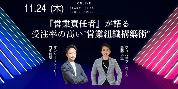 審査制・決裁者マッチング支援プラットフォーム「ONLY STORY」(サービスサイト:https://onlystory.co.jp/service/ )、「チラCEO」を運営する株式会社オンリーストーリー(代表取締役:平野哲也、本社:東京都渋谷区)は、株式会社ウィルグループの子会社で、総合人材サービスを手掛ける株式会社ウィルオブ・ワーク(代表取締役社長:告野 崇、本社:東京都新宿区)と11月24日(木)11時より無料ウェビナー「『営業責任者』が語る受注率の高い”営業組織構築術” 」を開催します。