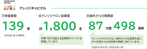 特に「ナレッジキャピタル」には、企業・研究機関・大学など139の団体が参画しており、「感性」と「技術」を融合することで、新しい価値を生み出す知的交流の場として、またイノベーション創出のための先進事例として、世界からも注目を集めています。その結果、海外からの視察件数はこの10年間で87ヵ国498団体にものぼります。