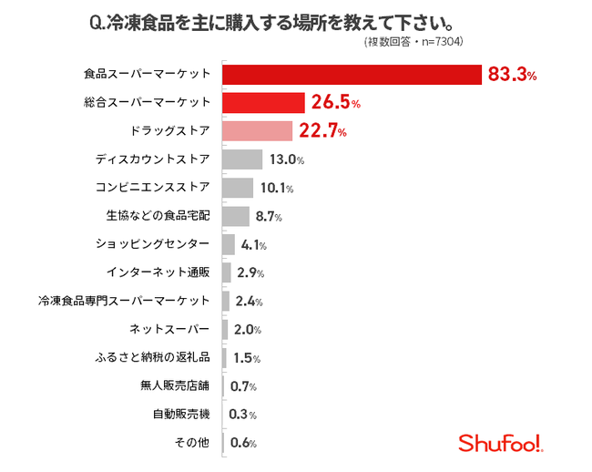 ■冷凍食品を購入する場所は「食品スーパーマーケット」、「ドラッグストア」も健闘
