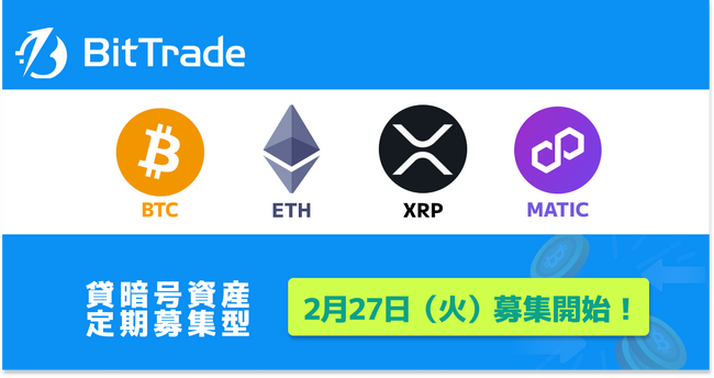 ビットトレード株式会社(所在地:東京都港区、代表取締役社長:関 磊、以下「ビットトレード」)は、2024年2月27日(火)12:00より、 ビットコイン(BTC)、イーサリアム(ETH)、エックスアールピー/リップル(XRP)、ポリゴン(MATIC)の貸暗号資産「定期募集」を実施いたします。是非ご参加ください。