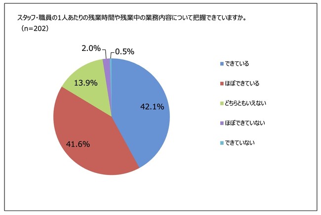 『スタッフ・職員1人当たりの残業時間や残業中の業務内容について把握できているか』をたずねたところ、8割を超える経営者が「できている」(42.1%)「ほぼできている」(41.6%)と答えました。