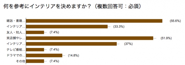 一番多かった回答は「雑誌・書籍・Web」が55.6%、次いで「実店舗を訪れる」が51.9%、「インテリア上手な人のブログやSNSなど」が37%となりました。