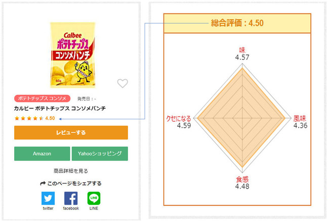 商品にとって重要な要素を、カテゴリ別に評価項目として事務局が設定しています。評価者はそれぞれの項目について評価し、その平均点を評価者の総合評価とします。評価者の総合評価から、商品の総合評価を算出しています。漠然とした商品の評価ではなく、より詳細な評価が出るように設計されています。また、総合評価点と各評価項目点は商品レビューページにレーダーチャートでわかりやすく表示されています。