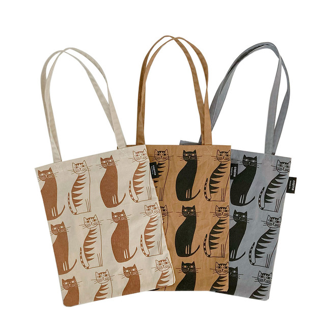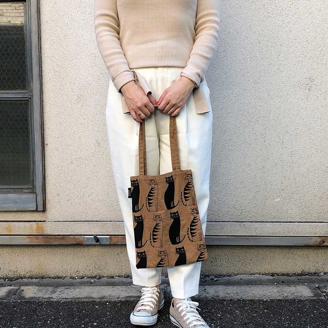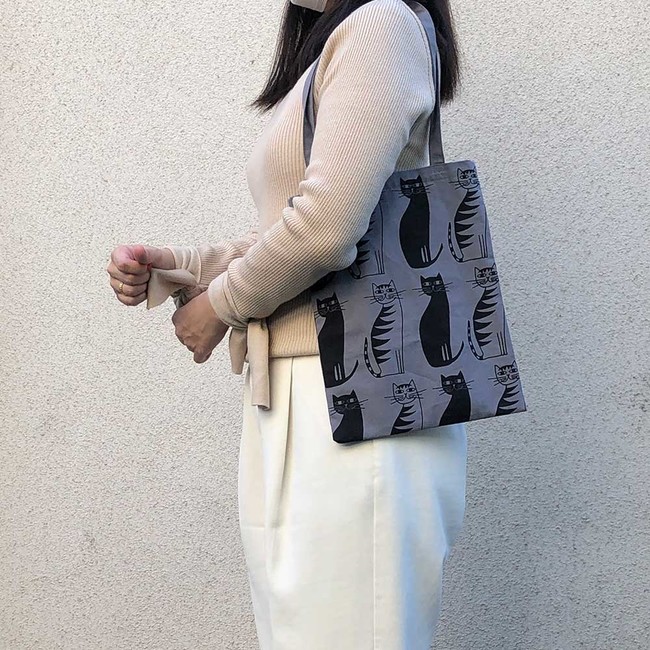 ねこたちが整列する、シンプルだけどポイントになるデザインのフラットトート。薄手コットンの生地はナチュラルな風合いで、お財布とスマホを入れて身軽にお出かけしたい春におすすめです。A4が入るサイズでサブバッグにもぴったり。