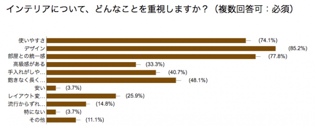 ホームパーティー好きな人へ聞いたところ、一番多かった回答は「デザイン」(85.2%)でした。次いで「部屋との統一感」(77.8%)、「使いやすさ」(74.1%)と続きます。