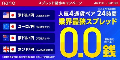 【nano】24時間主要4通貨ペアで「業界最狭スプレッド0.0銭」を提示!