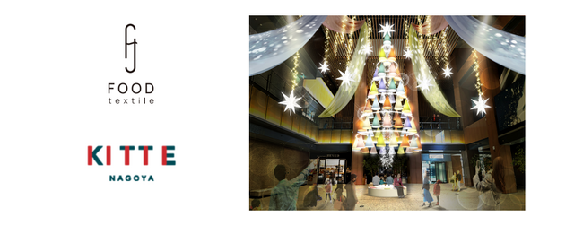 今年のKITTE名古屋のテーマが「喜び輝く(DELIGHT)クリスマス」となった中、大切な人と集う機会が増えるこの時期に人々に笑顔になってもらいたい、“Deli(ドイツ語で「美味しいもの」の略)+light”のとおり、“食”から生まれた輝く光で喜びを分かち合いたい、という思いの元、このたびツリーの装飾にFOOD TEXTILEを採用いただきました。