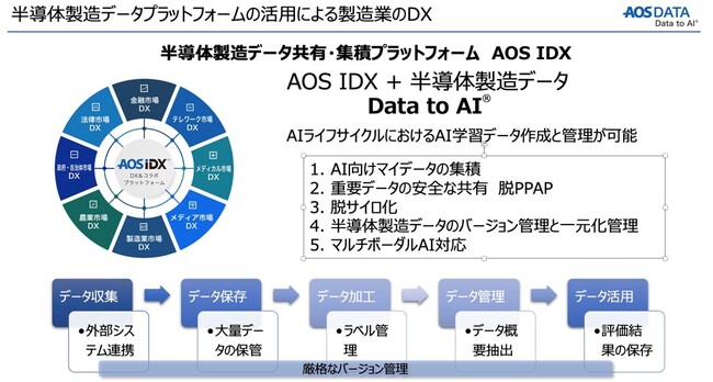 AOS IDXでは、こうしたAIライフサイクルの仕組みとマルチモーダルAIへの適用に基づき、AIデータにおけるAIシステムのためのAIデータ管理を行い、企業における優秀なデータがあって初めて優秀なAIシステムを実現できるというData to AIのコンセプトの元、AOS IDXによって、半導体産業の発展に向けたプラットフォーム構築を支援します。