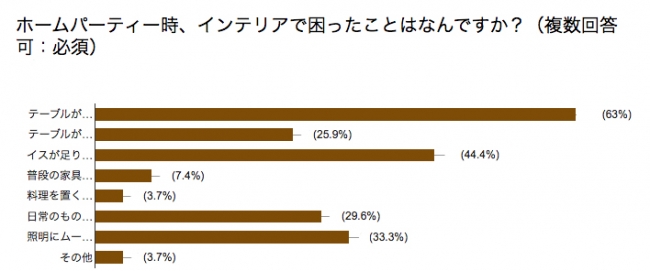 ホームパーティー好きな人へ聞いたところ、一番多かった回答は「テーブルが小さい」(63%)でした。次いで「イスが足りない」(44.4%)、「照明にムードがない」(33.3%)と続きます。