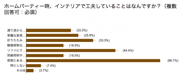 ホームパーティー好きな人へ聞いたところ、一番多かった回答は「部屋にある日常的な物を片付ける」(66.7%)でした。次いで「ソファにクロスなどをかけてカラーコーディネート」(44.4%)、「折りたたみイス、テーブルなどを出す」(33.3%)と続きます。