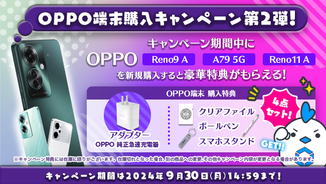 現在開催中の「OPPO端末購入キャンペーン第2弾」において、「OPPO Reno11 A」をキャンペーン対象端末に追加いたします。