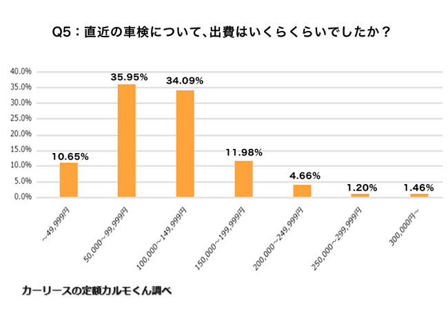 続いて、直近の車検について出費がいくらくらいか聞いたところ、最も多かったのは「50,000〜99,999円」で35.95%、次に多かったのが「100,000〜149,999円」で34.09%という結果になりました。