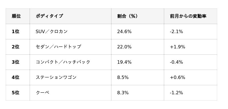 国産車ボディタイプ別買取ランキングは、1位の軽自動車から5位のセダン/ハードトップまで前月と同様でした。全体における各ボディタイプの割合は、軽自動車が若干伸びた以外は前月とほぼ変わらずに推移しています。