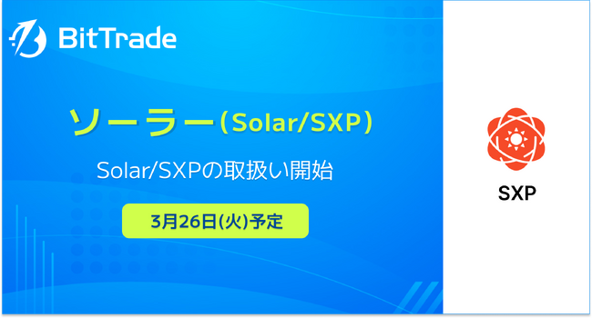 ビットトレード株式会社(所在地:東京都港区、代表取締役社長:関 磊、以下「ビットトレード」)は、暗号資産ソーラー(Solar/SXP)の入出金、販売所での取扱いを3月26日(火)(予定)より開始することをお知らせいたします。