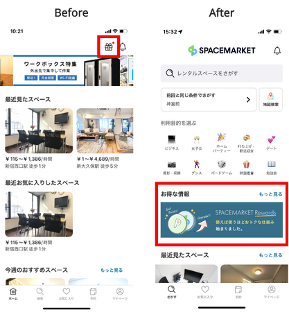 これまでキャンペーンや特典などの情報を取得するにはアプリ画面右上のプレゼントマークから飛ぶ必要がありましたが、ホーム画面中央に大きく表示することでユーザーにとってお得な情報を見つけやすくしました。