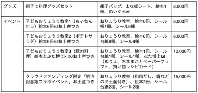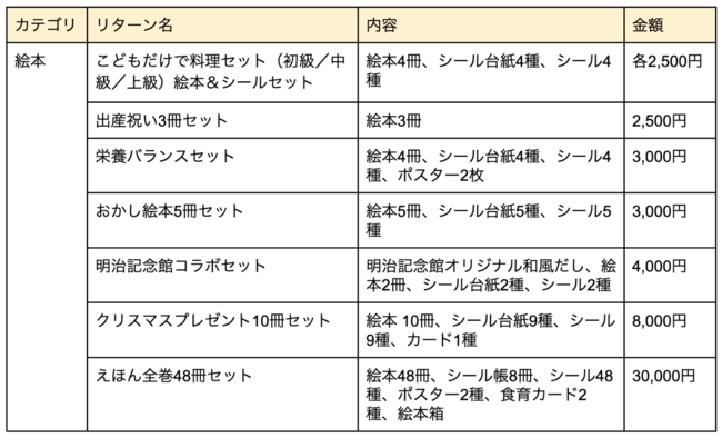 本プロジェクトでは、集まった支援をおりょうりえほんの食育活動に活かすだけでなく、返礼品として、通常サブスクリプションサービスで毎月届けている食育絵本のセットや、おりょうりえほんが主催する料理教室への参加権を、直接支援者に提供します。食育絵本やグッズは、海外在住の支援者にも届けることが可能です。