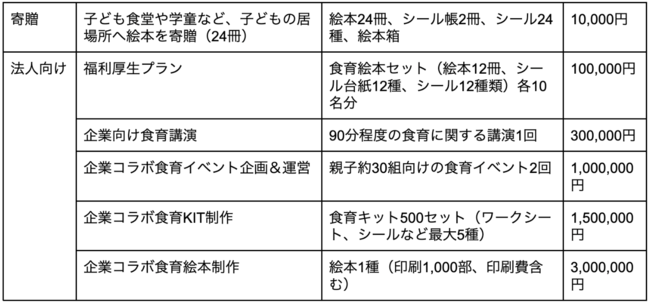 また法人向けの返礼品として、食育に関する講演やイベント、オリジナルの食育絵本や食育キットの制作などを提供することで、クラウドファンディング終了後さまざまな企業・団体と共に幅広い食育活動を展開していきます。
