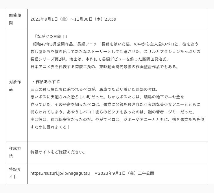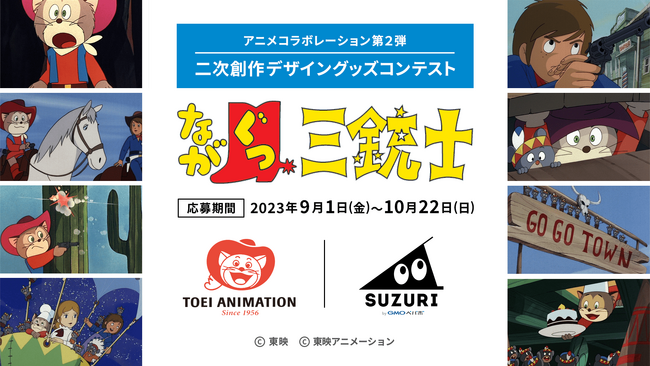 東映アニメーション株式会社(代表取締役社長:高木 勝裕 以下、東映アニメーション)とGMOインターネットグループのGMOペパボ株式会社(代表取締役社長:佐藤 健太郎 以下、GMOペパボ)が運営するオリジナルグッズ作成・販売サービス「SUZURI(スズリ) byGMOペパボ」(URL:https://suzuri.jp/)は、コラボレーション企画『東映アニメ|SUZURI byGMOペパボ アニメコラボ』(特設サイトURL:https://suzuri.jp/lp/nagagutsu *2023年9月1日(金)正午公開)の第2弾として、2023年9月1日(金)〜11月30日(木)の期間、二次創作デザイングッズコンテストなど、以下5つの企画を実施いたします。