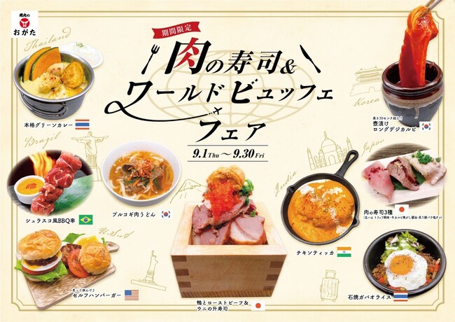 精肉のおがたの定番のフェア、9月のテーマは肉祭りと世界旅行!
