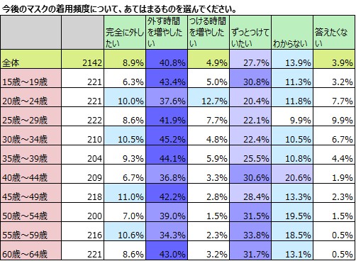 「ずっとつけていたい」は20歳〜39歳が少なく、それ以外の年代は多い傾向。