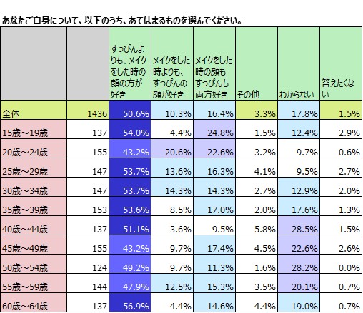 全体では50.6%と半数を超える人が、「すっぴんよりもメイクをした顔の方が好き」と答えています。「メイクをした時よりもすっぴんの方が好き」と答えたのは10.3%と約1割。「メイクをした顔もすっぴんも両方好き」の人は16.4%でした。 これを年齢別に見てみると、「すっぴんよりもメイクをした時の顔の方が好き」と答えている人は、全世代で40%台の半ばから50%台の半ばにあてはまり、年齢による意識の差はほとんどないことがわかりました。「すっぴんよりもメイクをした顔の方が好き」が最も多かったのは60歳〜64歳で、次に多いのが15歳〜19歳です。若年層でも高齢層でも変わらない割合でメイクをしている顔の方が好きと答えていることは興味深い結果です。「メイクした顔もすっぴんも両方好き」と答えた人が多いのは15歳〜19歳で24.8%、20歳〜24歳で22.6%と、2割を超えるのは若年層でした。