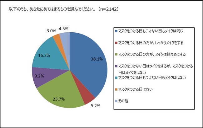 3. マスクをつける日のメイク、「普段と同じ」約4割。「メイクは控えめ」約2割。「メイクはしない」約1割。
