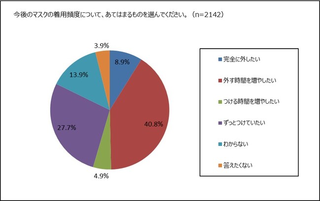 2.今後のマスク着用頻度「外したい」約5割、「ずっとつけていたい」約3割。