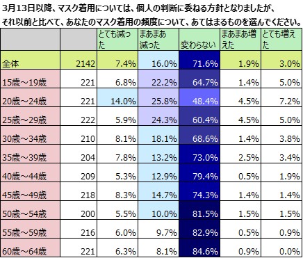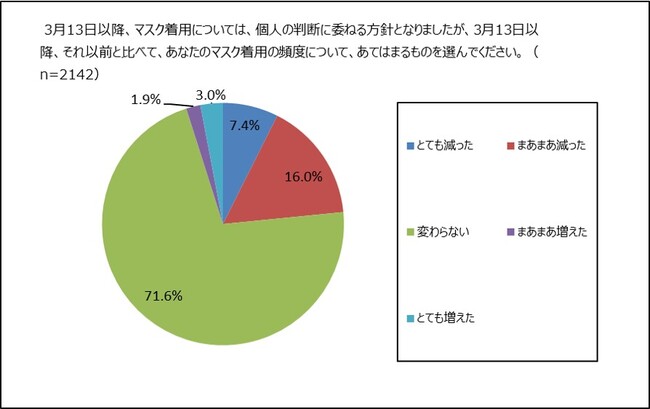 1.マスク着用頻度、「変わらない」が7割超。50代以上は8割超が「変わらない」。