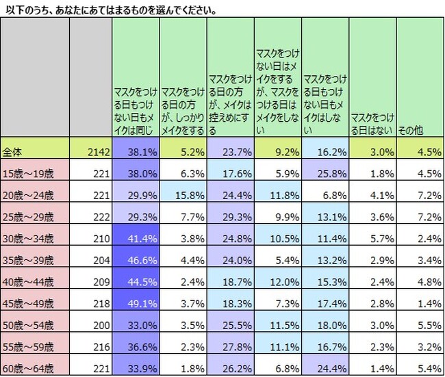 マスクをつける日とつけない日で、メイクが異なるか否か聞きました。マスクの着用の有無に関わらず同じと答えた女性は38.1%と約4割。「マスクをつける日のメイクは控えめにする」が23.7%と約2割。「マスクをつけない日はメイクをするが、マスクをつける日はメイクをしない」9.2%と合わせると32.9%で、マスクをつけることによってメイクの使用意向が減る人が3割以上です。年齢別で見てみると、「メイクは同じ」の割合が多いのは30代〜40代で、いずれも4割を超えています。20歳〜24歳では「マスクをつける日の方がしっかりメイクをする」と答える人が15.8%で、マスクをつけている時でも見えている目元や、マスクによってメイク崩れしやすい口元や頬などのメイクに注力していることがわかります。