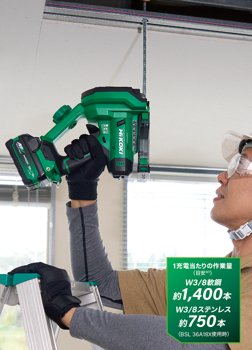 軟鋼W1/2など太径全ねじまで力強く切断でき、従来より少ない力でスムーズに作業できます。1充電あたりの作業量(目安※1)も向上し、W3/8軟鋼で約1,400本、W3/8ステンレスで約750本を切断可能。現場の連続作業効率を大幅に高めます。