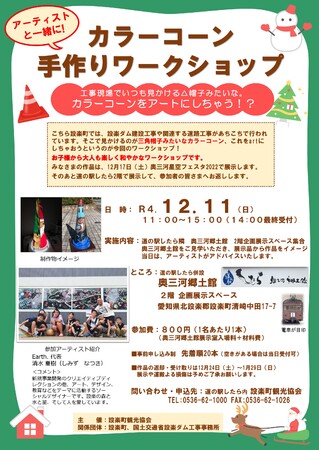 設楽町観光協会では、「カラーコーン手作りワークショップ」の参加者を募集します。現在、設楽町では、設楽ダム建設工事や関連する道路工事があちこちで行われています。そこで見かけるのが三角帽子みたいなカラーコーン。これをアートにしちゃおうというのが今回のワークショップです。
