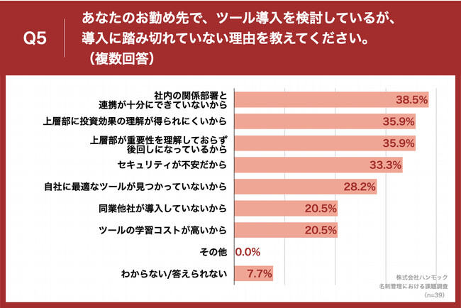 「Q5.Q2で「検討している」と回答した方にお伺いします。あなたのお勤め先で、ツール導入を検討しているが、導入に踏み切れていない理由を教えてください。(複数回答)」(n=39)と質問したところ、「社内の関係部署と連携が十分にできていないから」が38.5%、「上層部に投資効果の理解が得られにくいから」が35.9%、「上層部が重要性を理解しておらず後回しになっているから」が35.9%という回答となりました。