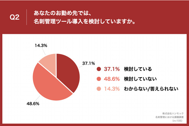 「Q2.あなたのお勤め先では、名刺管理ツール導入を検討していますか。」(n=105)と質問したところ、「検討している」が37.1%、「検討していない」が48.6%という回答となりました。