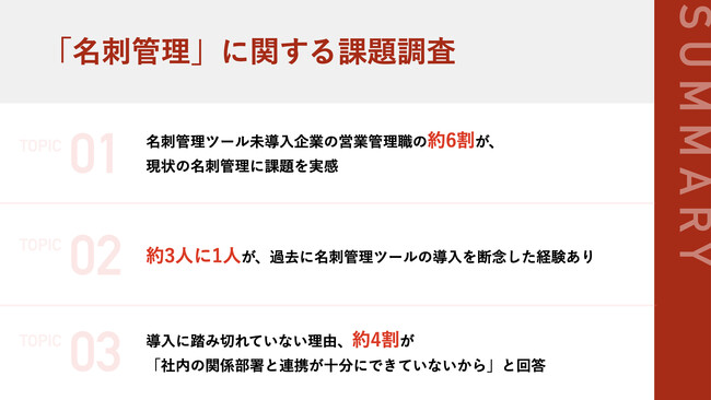 まず、名刺管理ツール未導入企業の営業管理職の6割以上が、現状の名刺管理に不満や課題を実感していることがわかりました。また、ツール導入を検討しているが、「社内の関係部署と連携が十分にできてないから」などといった理由から、導入に踏み切れていないことが明らかになりました。